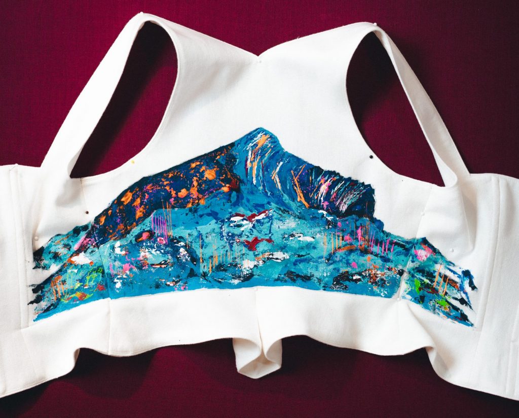 Das Besondere an diesem Projekt: Der Rock des Dirndls kann später abgenommen, auf einen Keilrahmen gespannt und als eigenständiges Gemälde an der Wand präsentiert werden. Das Candy-Mountains-Dirndl bewegt sich damit zwischen Couture, Malerei und Objekt – zunächst als Kleidungsstück im Raum, später als Bildfläche.
