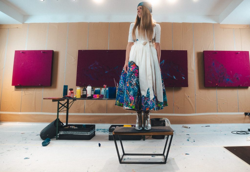 Am 29. November 2025 ist in Kooperation mit der Trachten- und Manufaktur Grasegger in Garmisch-Partenkirchen das erste Candy-Mountains-Dirndl entstanden. Im Rahmen einer sechsstündigen Live-Performance im Modehaus Grasegger habe ich ein blütenweißes Manufaktur-Dirndl wie eine Leinwand behandelt und in eine farbintensive Berglandschaft der Werkgruppe Candy Mountains verwandelt.